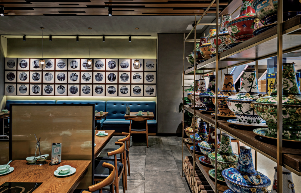 龙纹、牡丹、椰树…… 店门口精致的木质架上,喷绘有各色花纹的十八只景泰蓝铜锅整齐地码放其上, 形成一面壮观且精致的火锅墙。店内, 吊顶灯由黄纱笼罩,散发出朦胧美感。圆桌上摆放着青瓷碗、青瓷杯,玲珑青润……当东来顺走进江南、步入上海,在格调上也入乡随俗,进行了一次大调整。