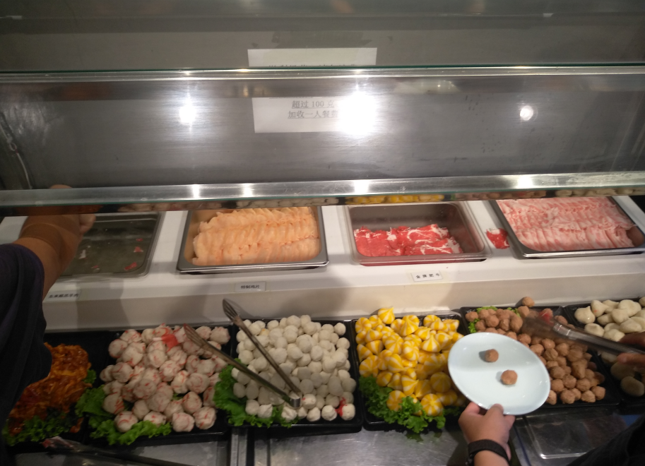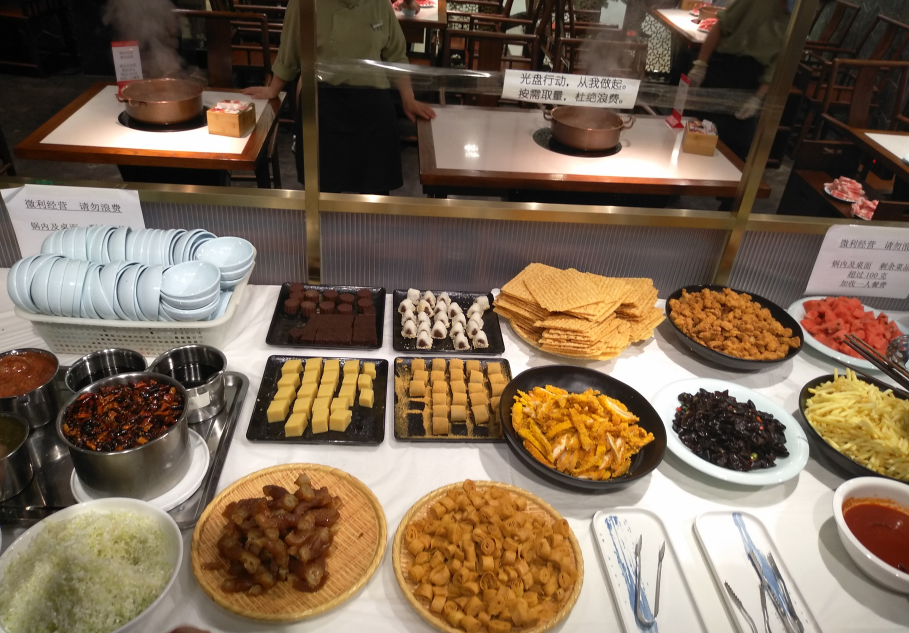 再加上餐桌、取餐处随处可见的锅内及桌面剩余菜品超过100克加收一人餐费的小贴士,很少有会客人一股脑拿许多食材。
