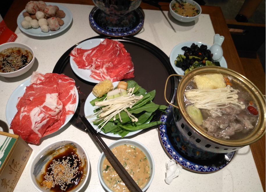服务员会根据用餐人数安排用餐位置,2人及以下提供更多一人一个的酒精加热的小铜锅,3人及以上提供更多电磁炉加热的大铜锅,不变的是老北京涮肉传统锅底——清汤。