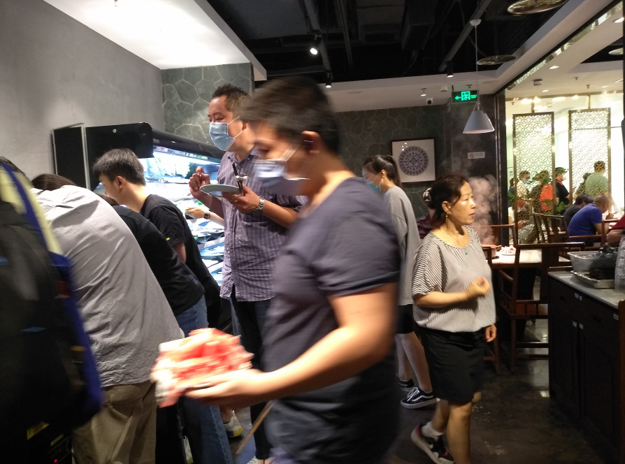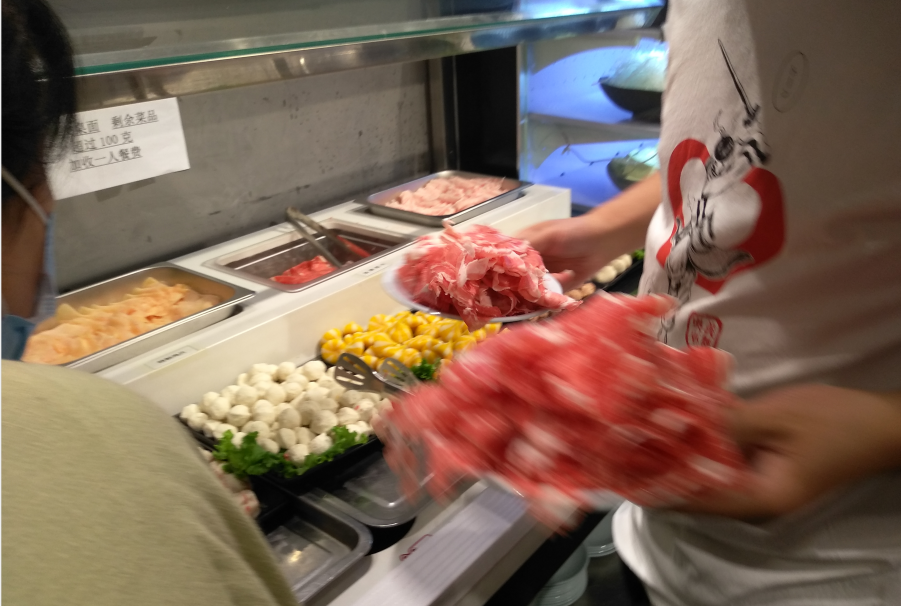 尽管如此,但牛羊肉区还是时刻都挤满了人,多数人拿1—2次够吃就不会再去了。
