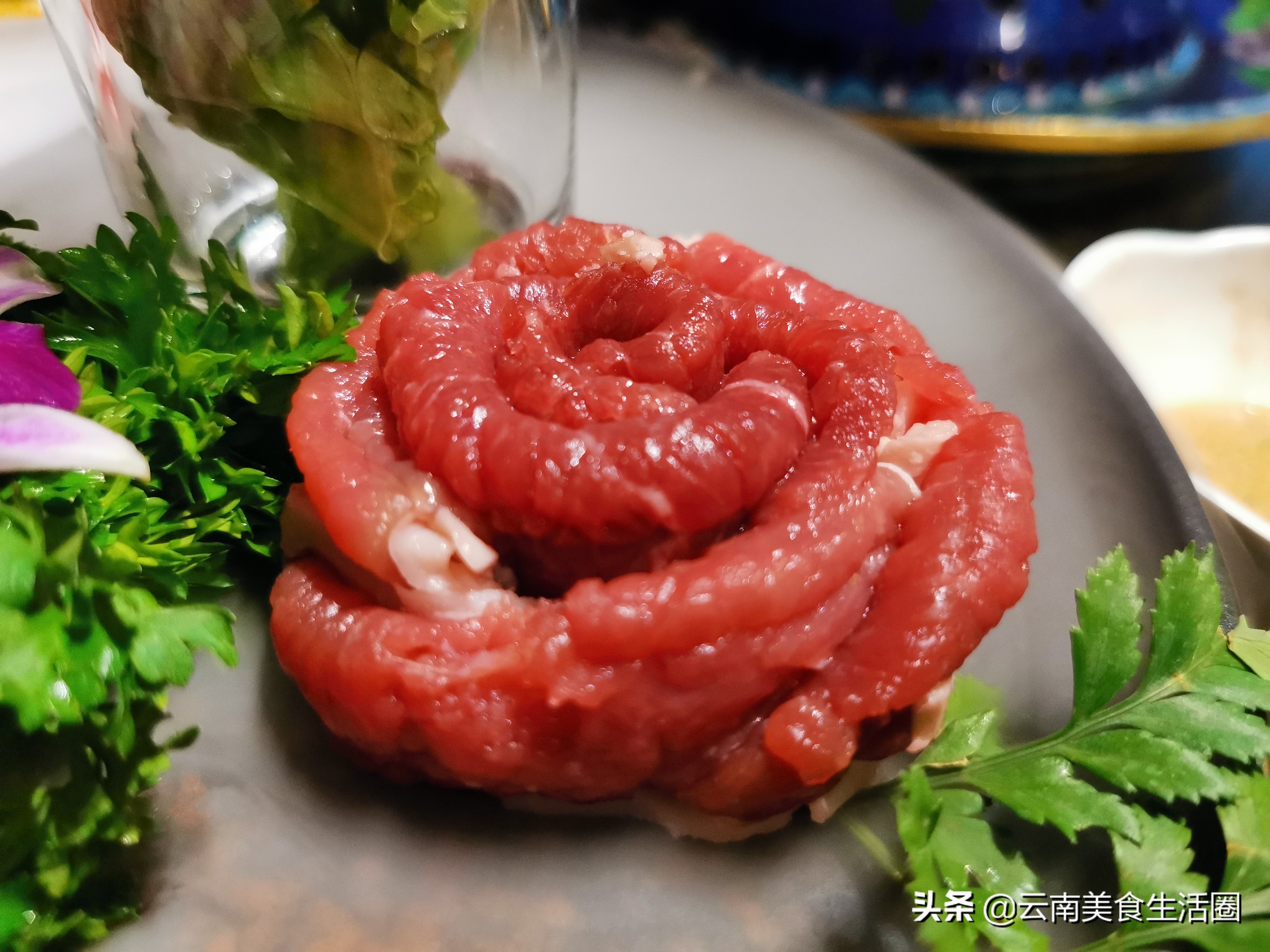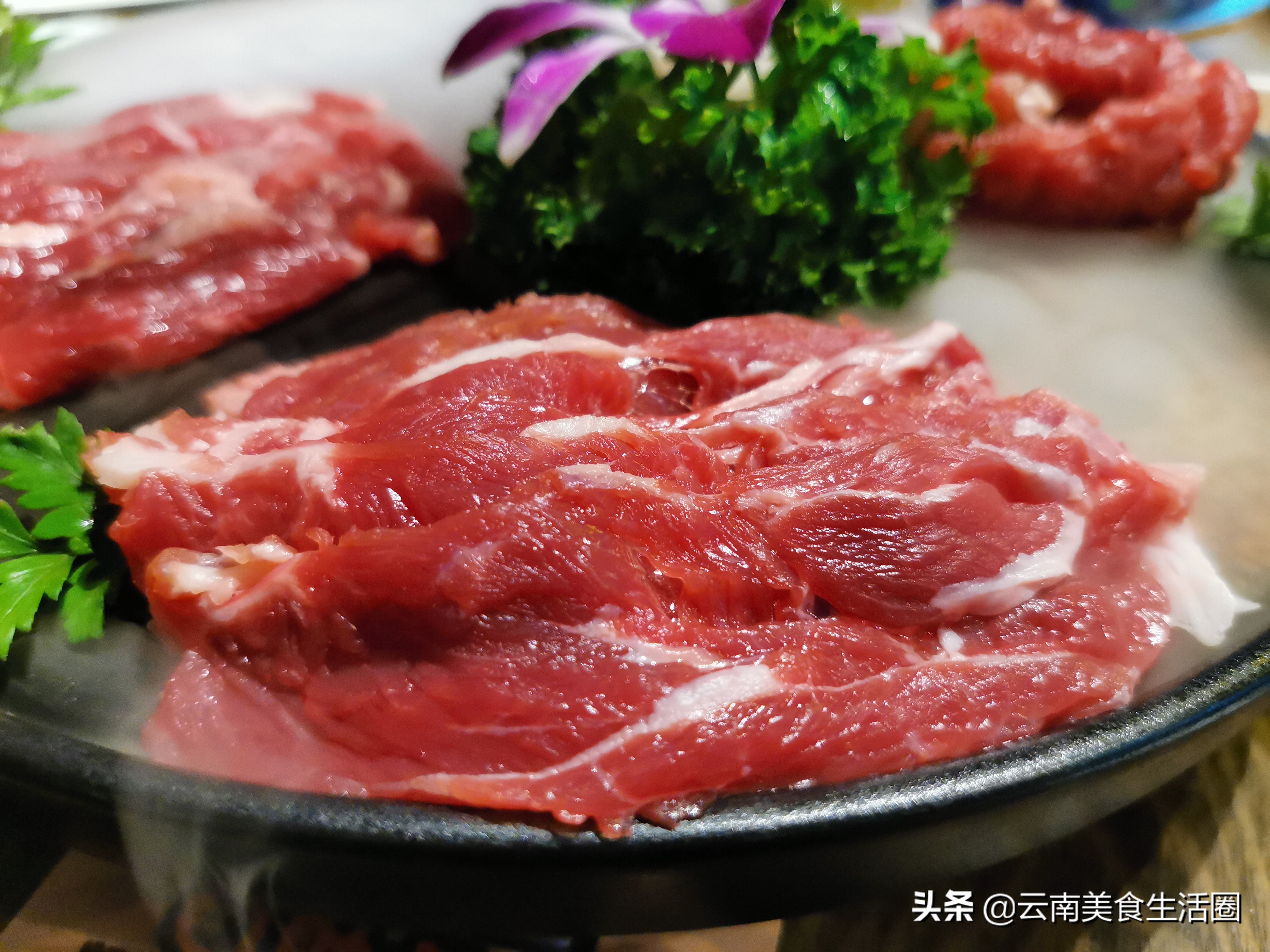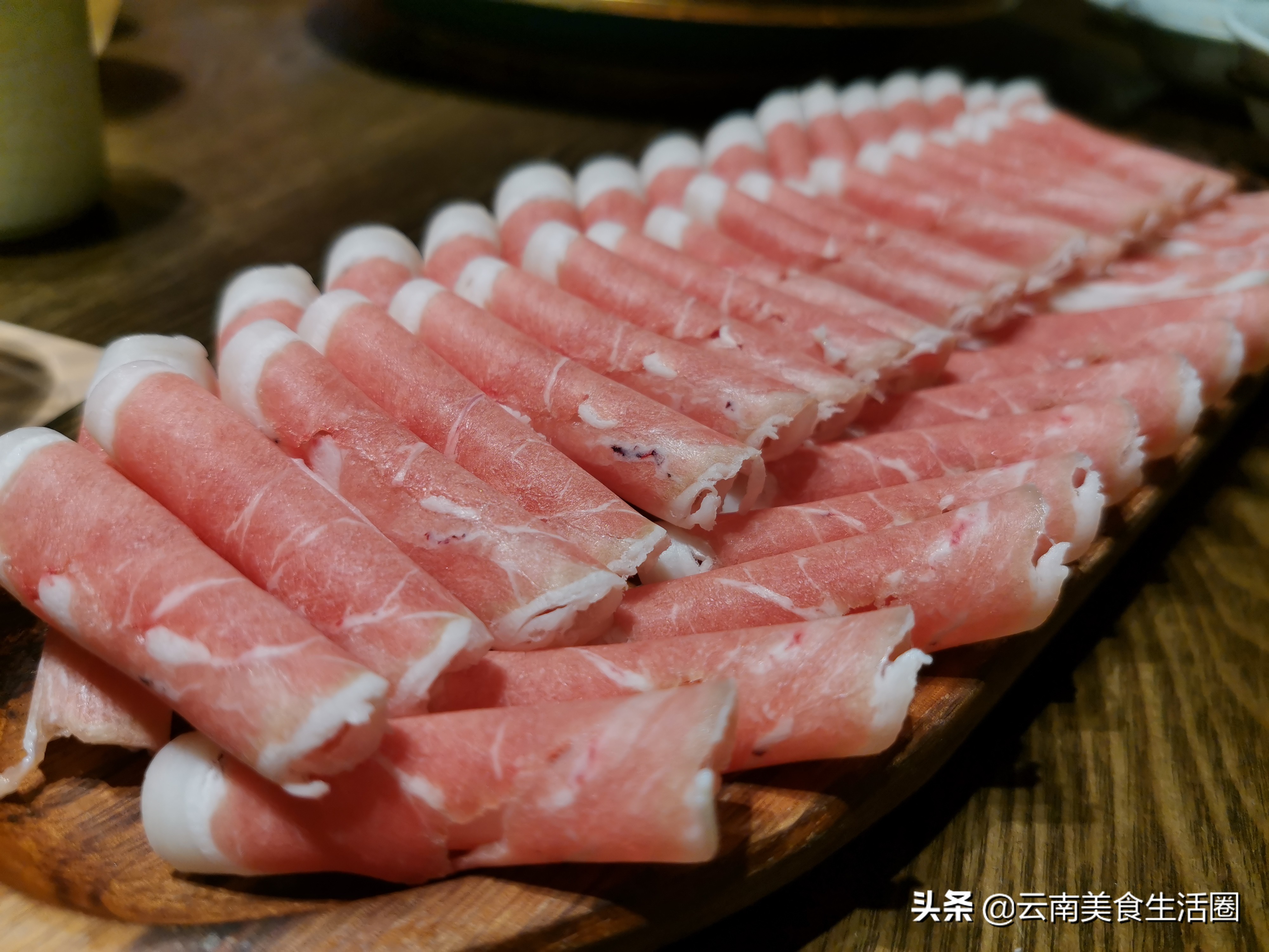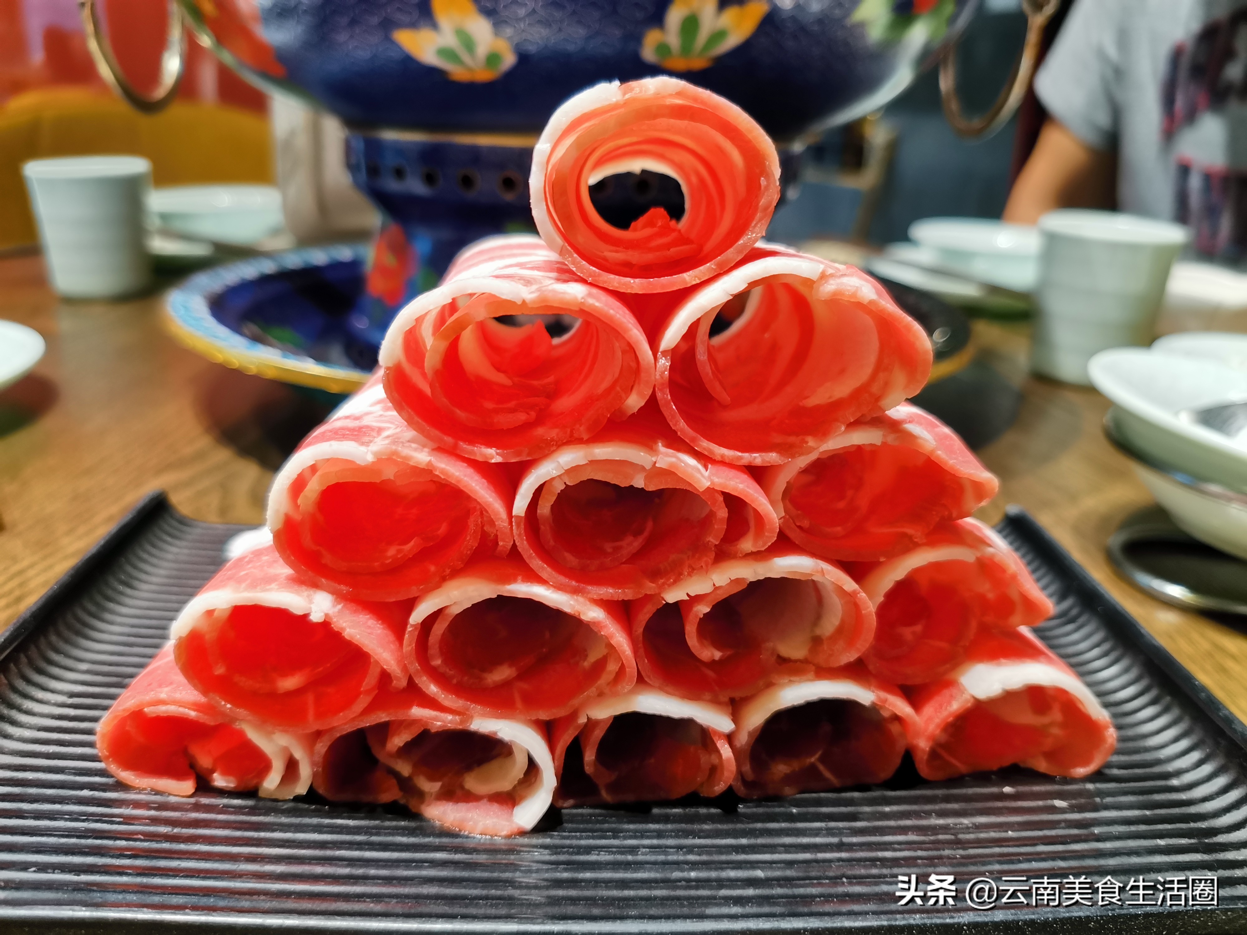 吃涮羊肉还得吃手切羊肉,手切羊肉是用新鲜的羊腿肉手工切成的。讲究的手切羊肉装盘后都会这样立着摆放,意思是这肉新鲜没有注水。一吃就知道这手切羊肉是冷冻肉解冻后切的,毕竟云南离绵羊的产区远,所以在这边不可能吃到新鲜羊肉。