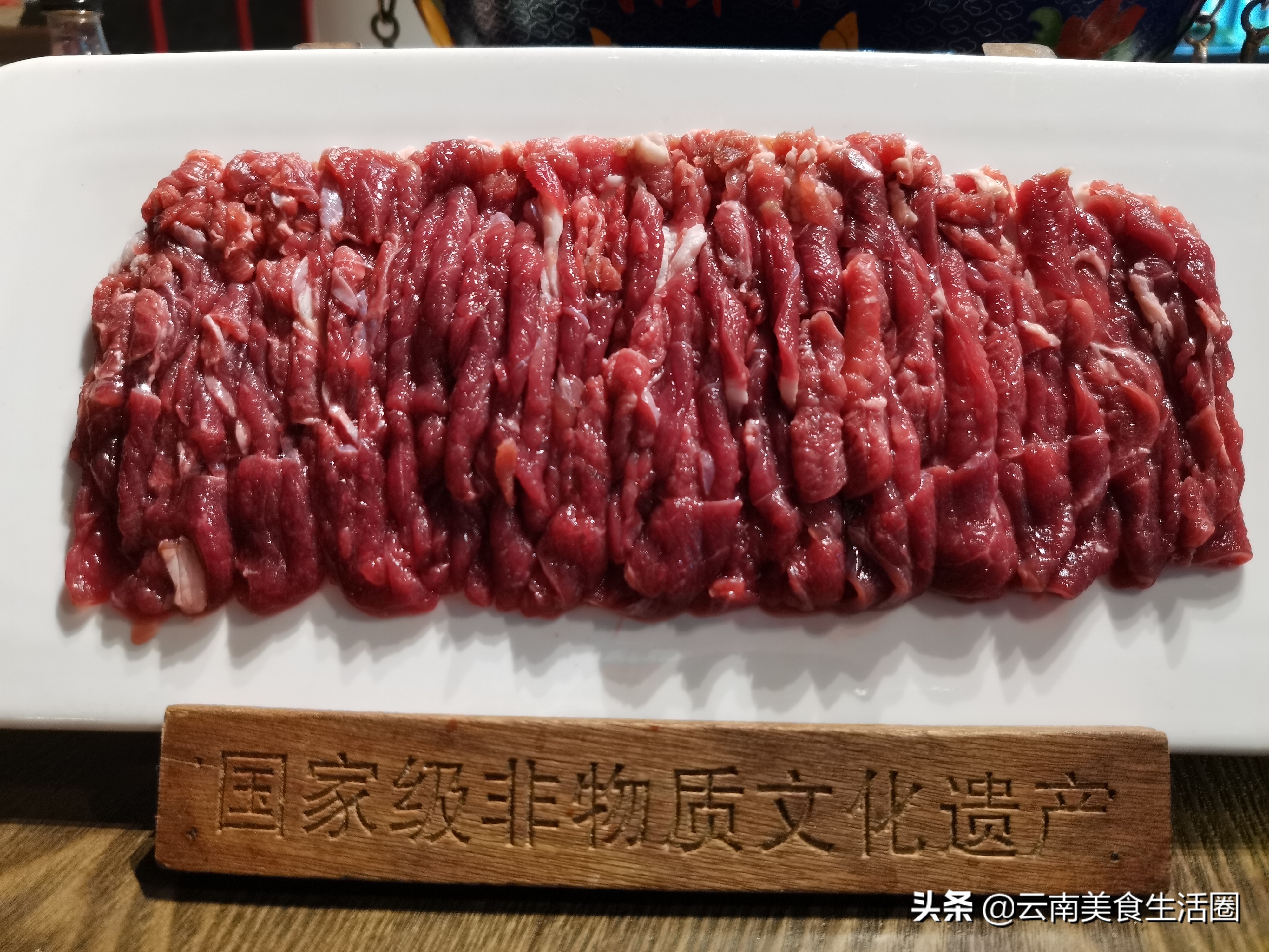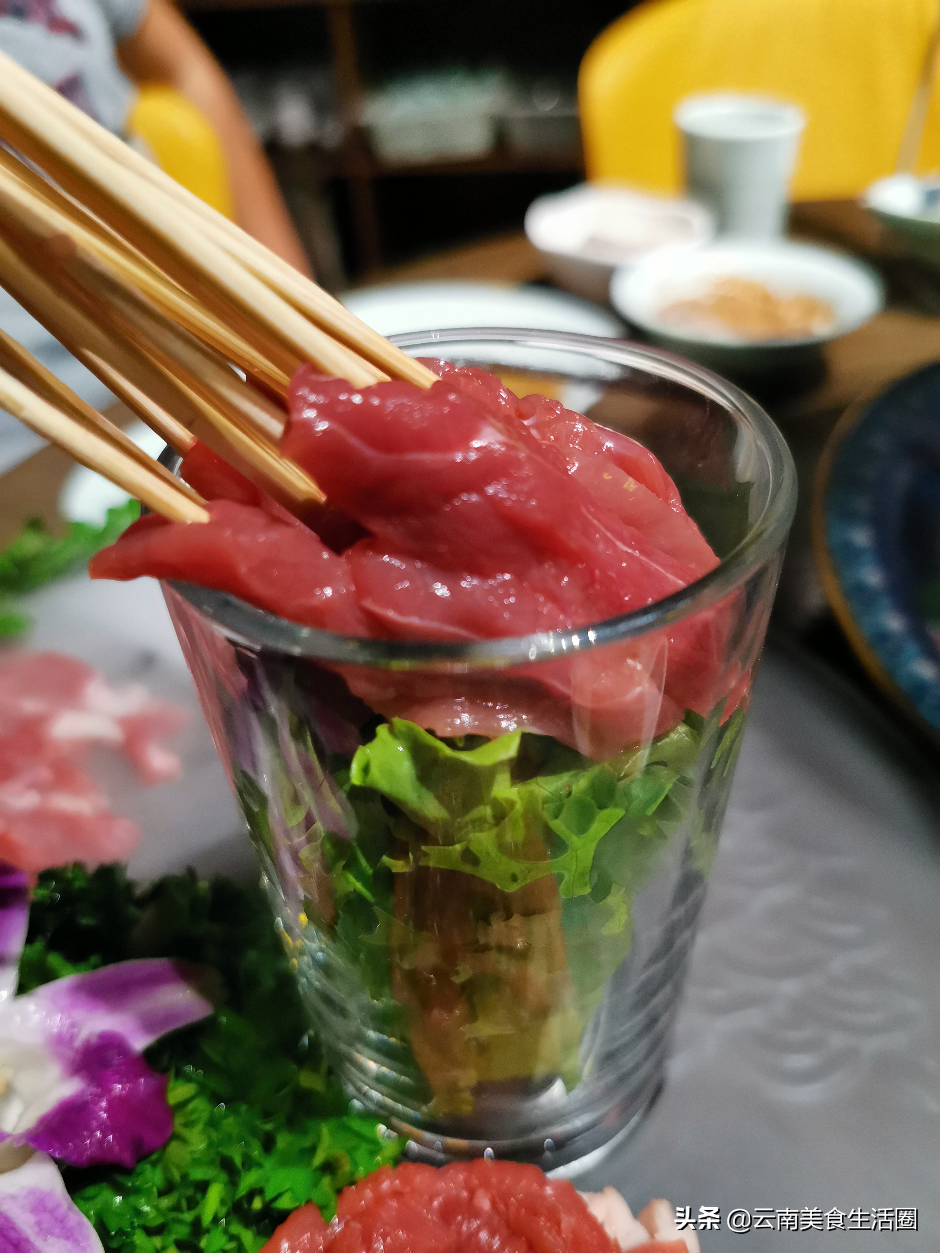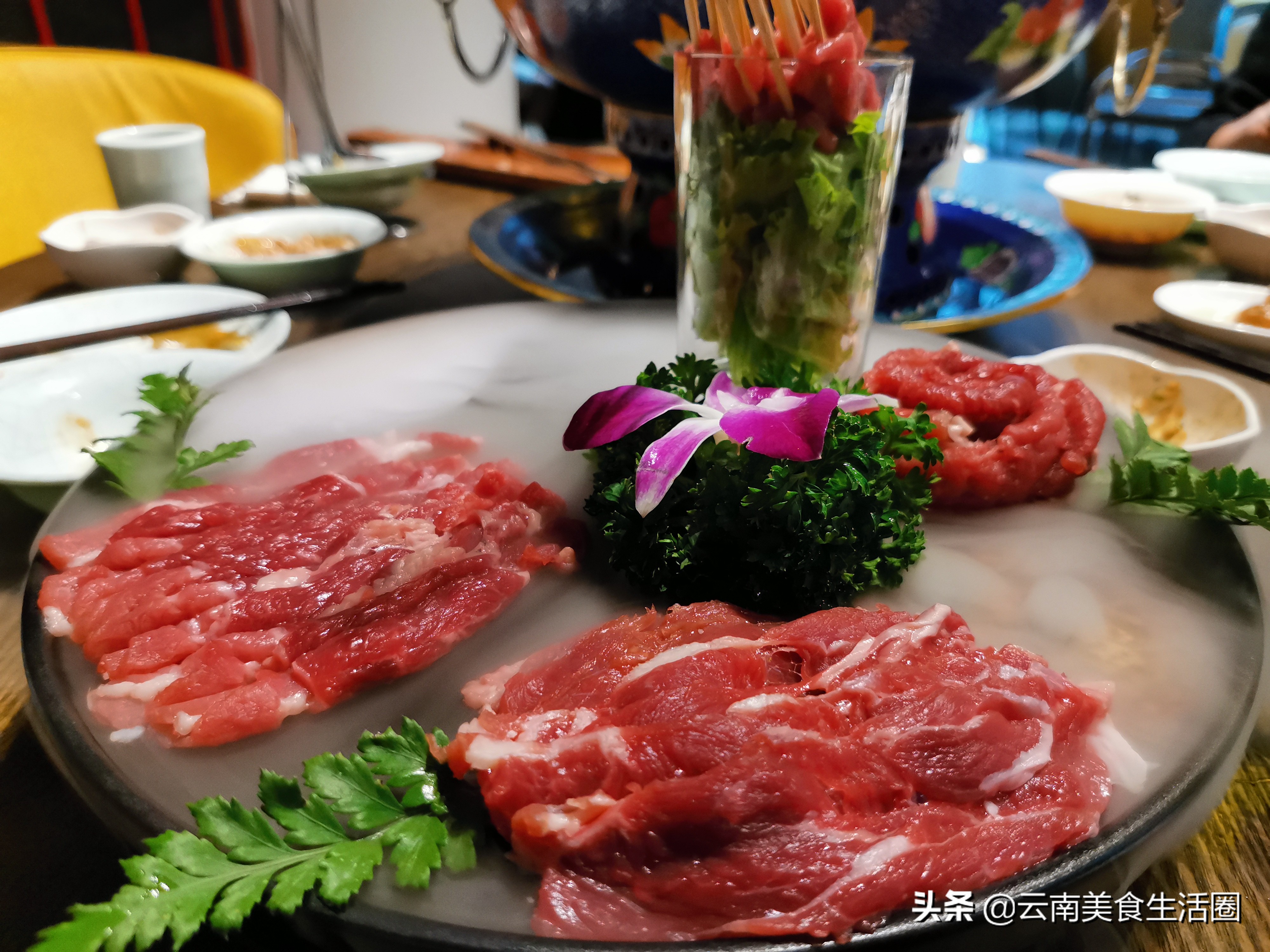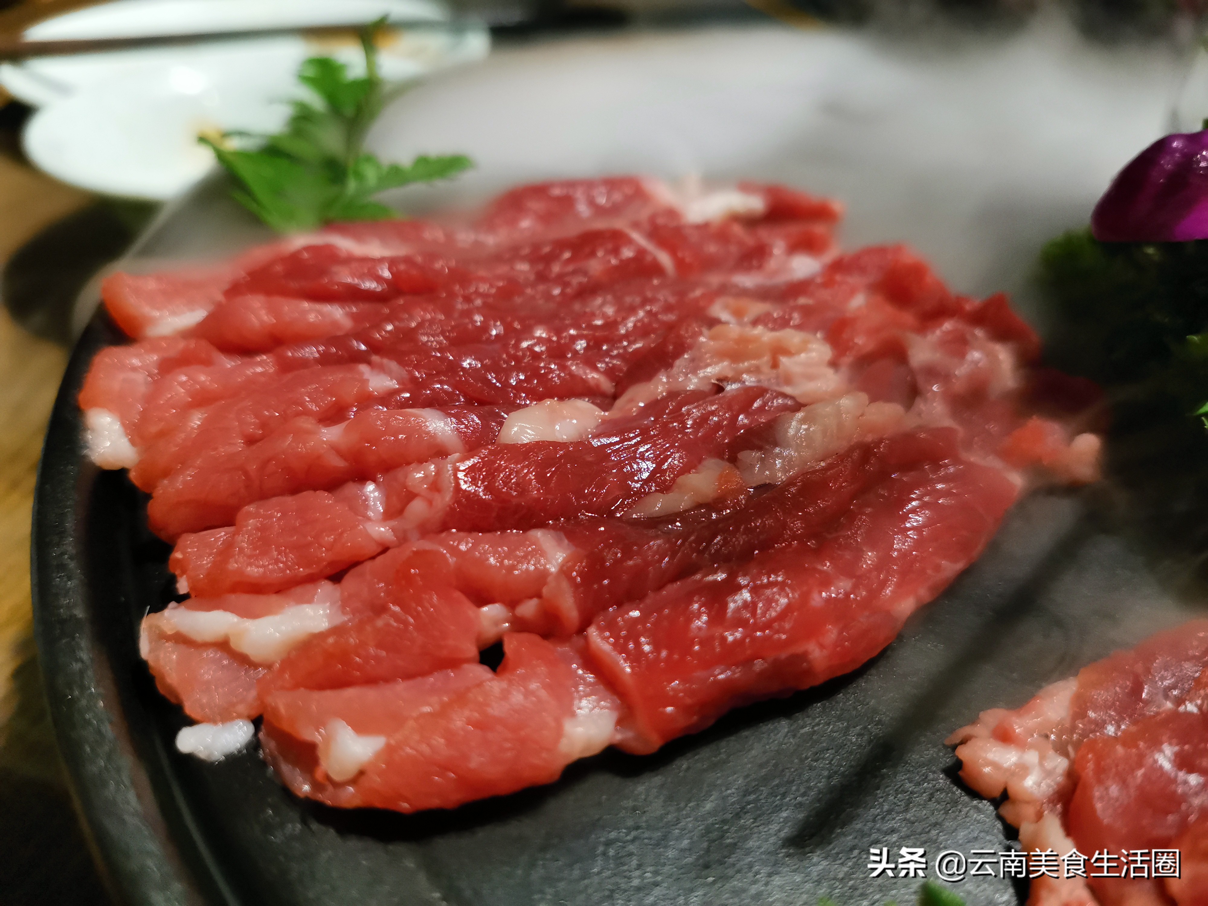 吃涮羊肉还得吃手切羊肉,手切羊肉是用新鲜的羊腿肉手工切成的。讲究的手切羊肉装盘后都会这样立着摆放,意思是这肉新鲜没有注水。一吃就知道这手切羊肉是冷冻肉解冻后切的,毕竟云南离绵羊的产区远,所以在这边不可能吃到新鲜羊肉。