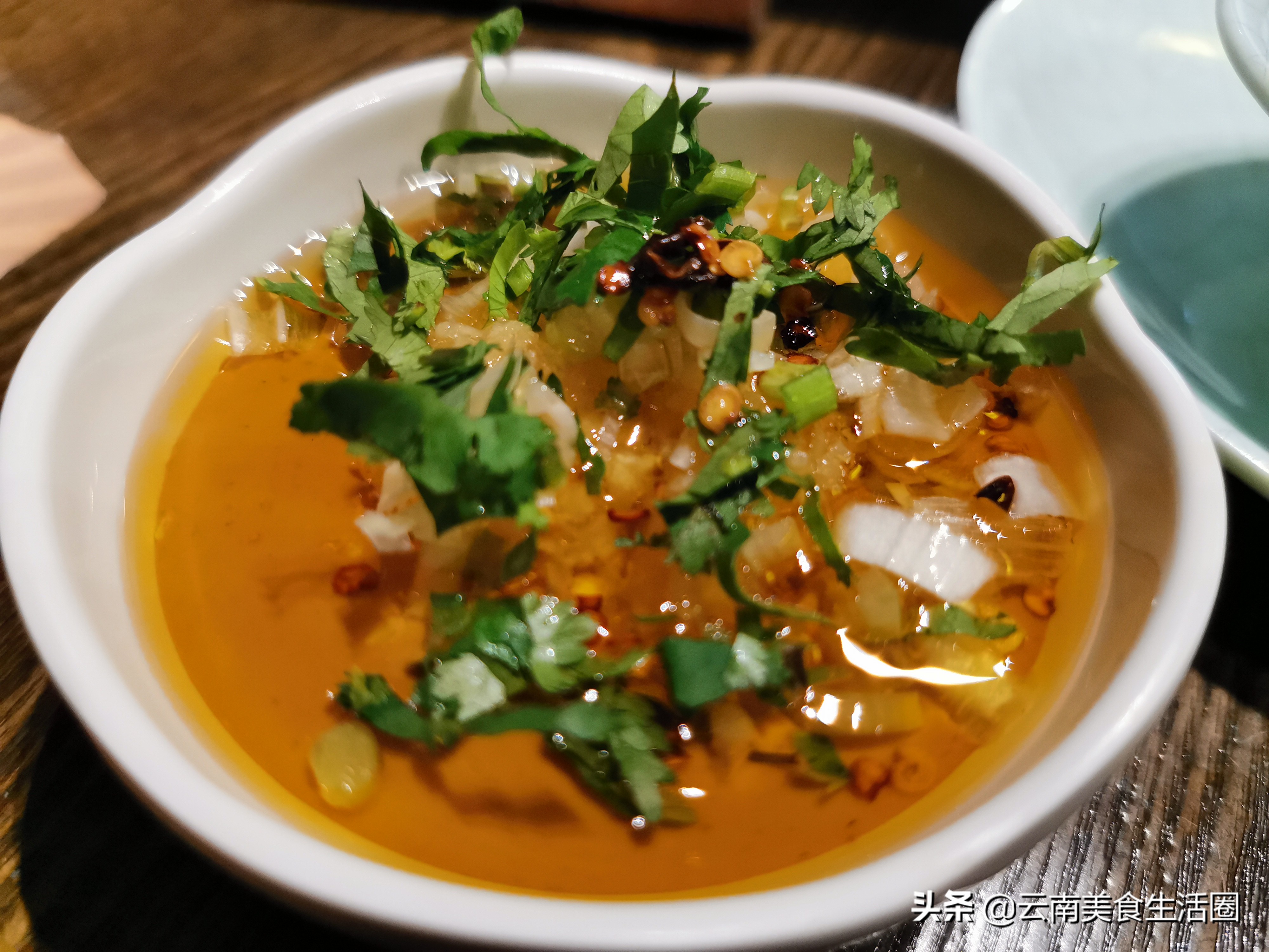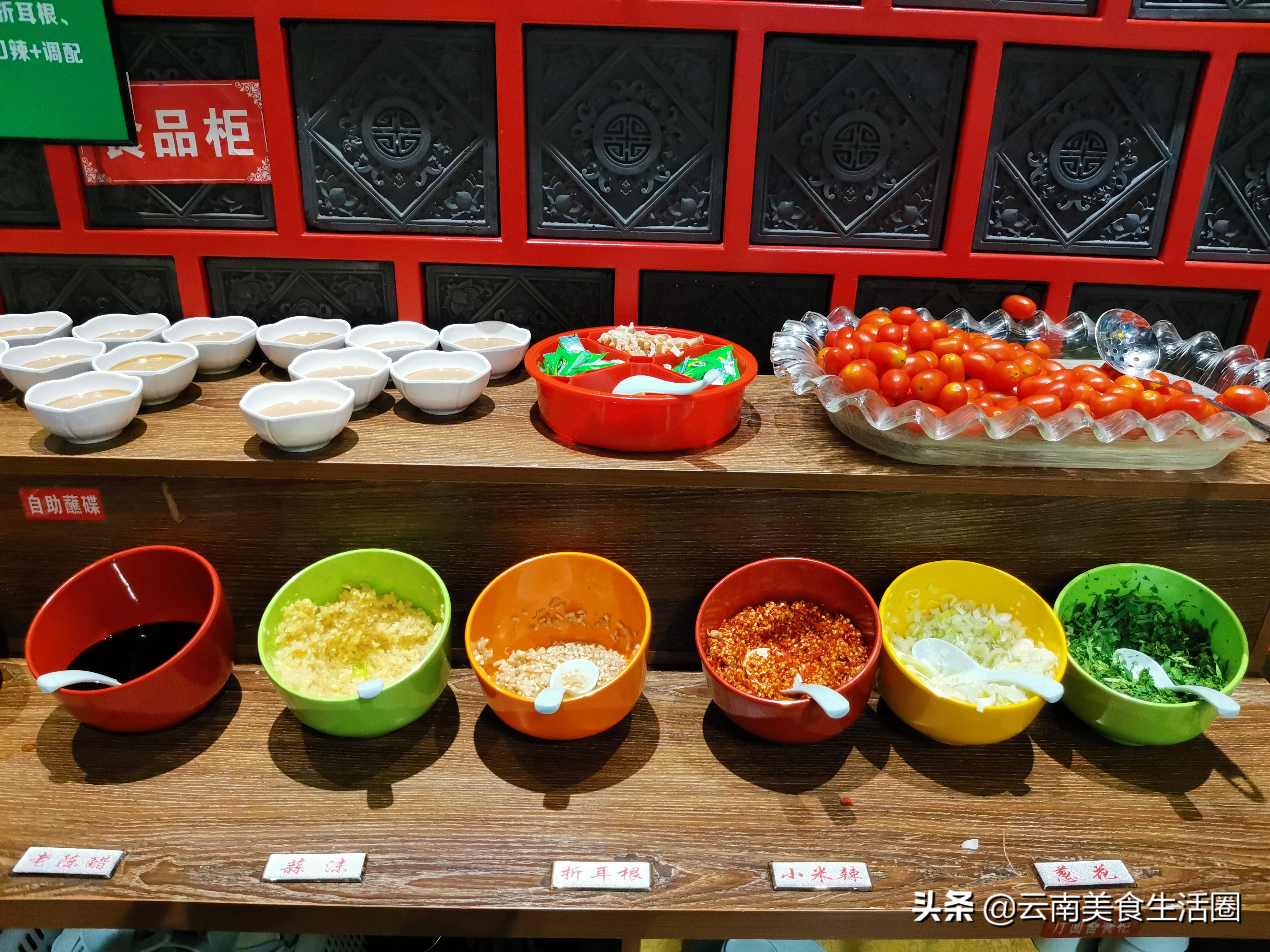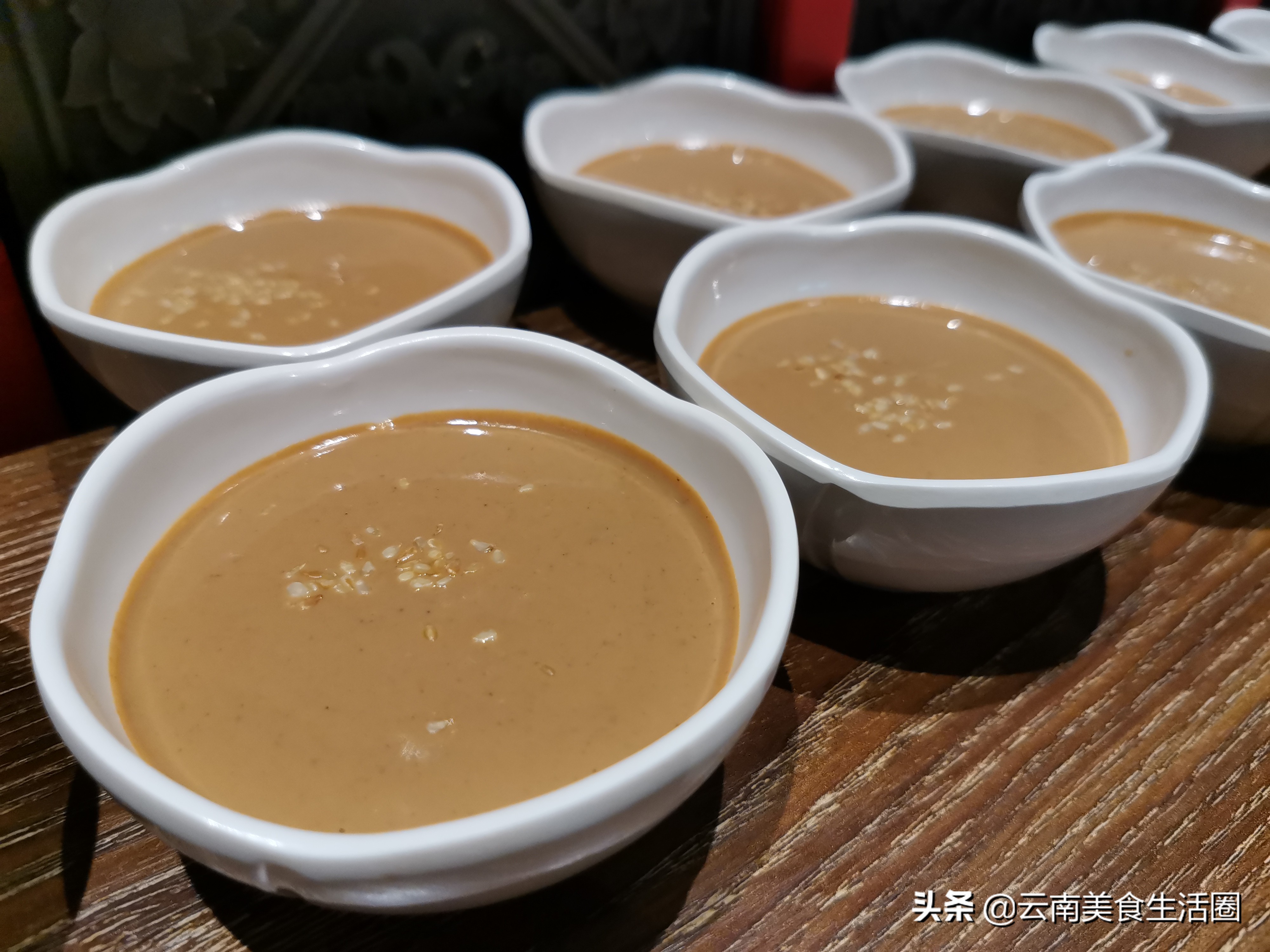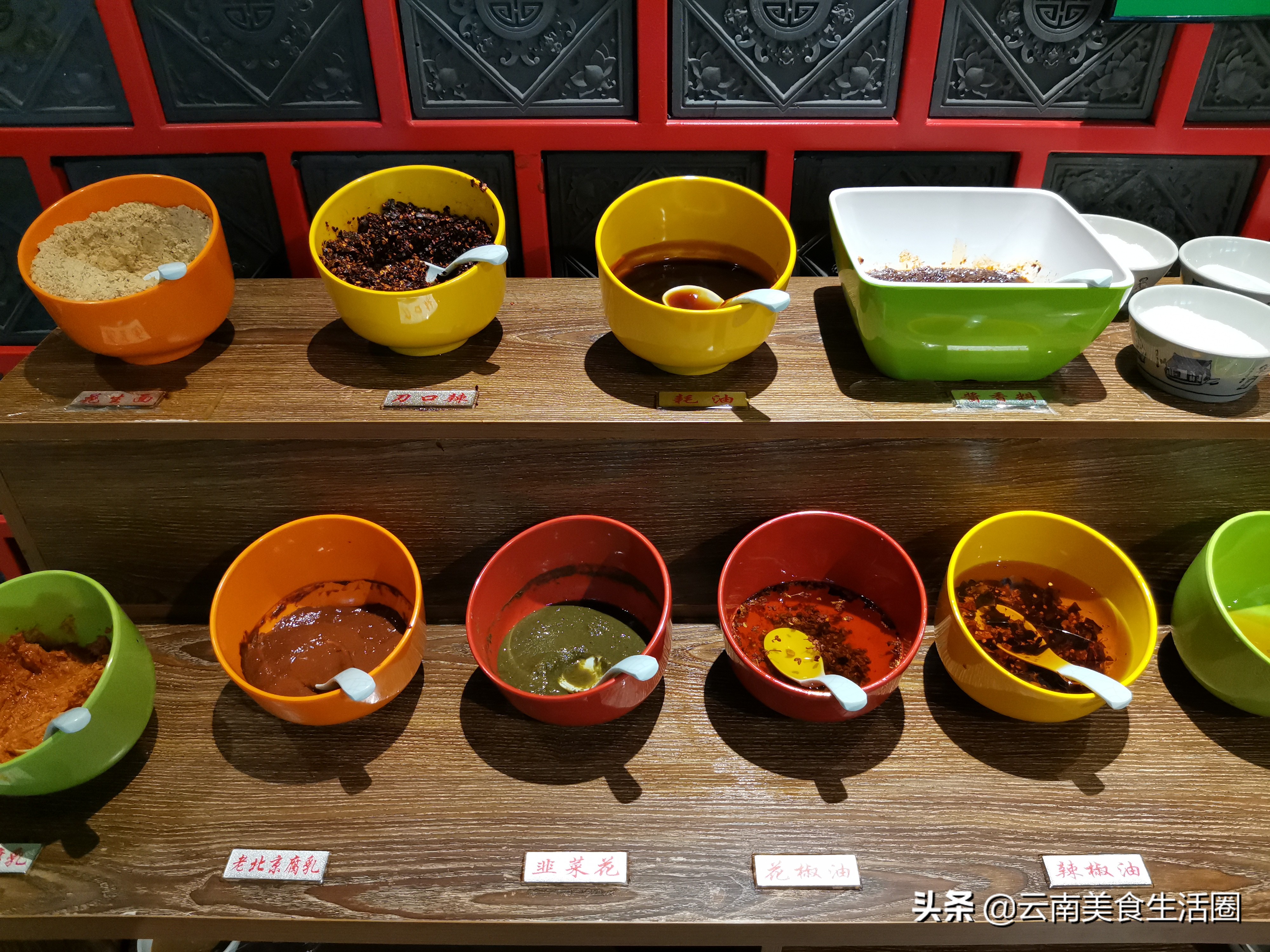 简单的芝麻酱蘸料不能满足云南吃货们挑剔的口味,所以为了适应当地的口味也有了比较丰富的调料台。地道的涮羊肉蘸料其实就是澥(xie四声)好的芝麻酱加上豆腐乳和韭菜花,还可以加点儿香菜末和葱花,喜欢吃辣的再来点儿现炸的辣椒油。