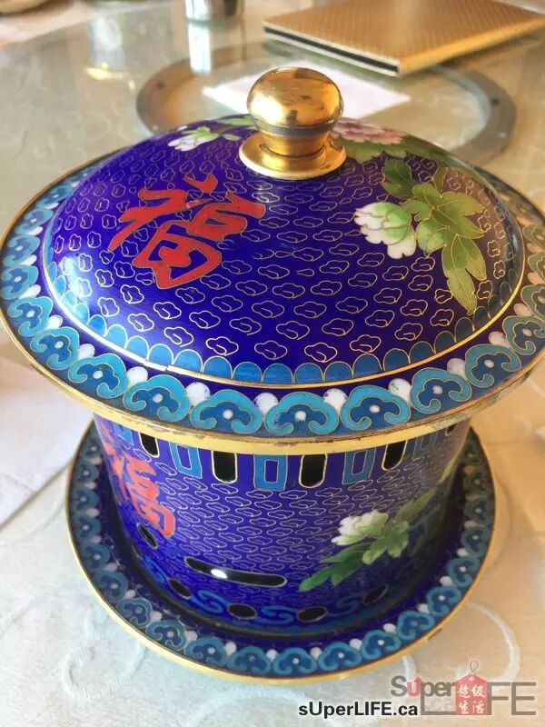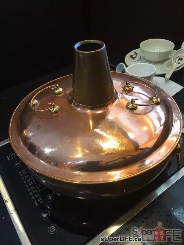店里的铜锅分两种,大铜锅是平底放在电磁炉上,小锅是景泰蓝包铜用单独的环保燃料加热。虽然少了烧炭这个特色,但是更干净、更环保,算是传统的碳锅上顺应时代的改良。尤其那景泰蓝包铜的小锅,用我们北京人的话来说就俩字儿——讲究!这可都是老板万里迢迢从背来的,在多伦多还没见过这么讲究的锅子呢。