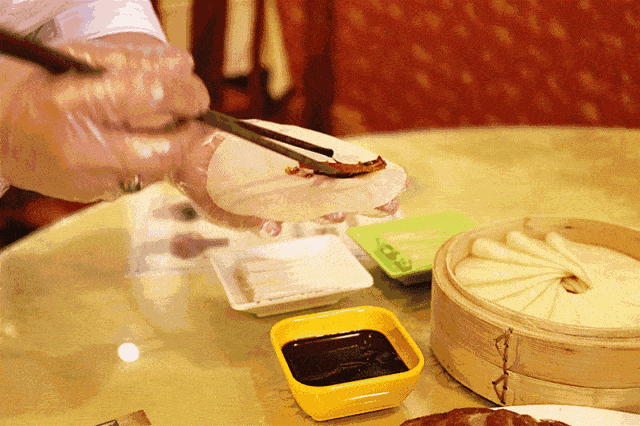 用筷子挑甜面酱抹在荷叶饼上!